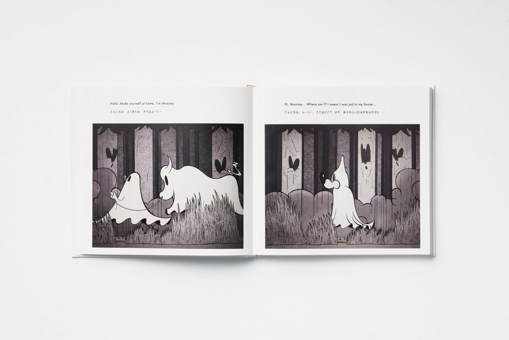 本書は、ストーリーとともにペインティング作品を展示した、ユニークな個展から生まれました。オバケの世界で気ままに暮らしていたムーニーが、ふとした出来事から大騒動を起こしたり、宇宙へ旅をしながら楽しい仲間と過ごす日々を絵とストーリーで展開する、絵本のような作品集です。